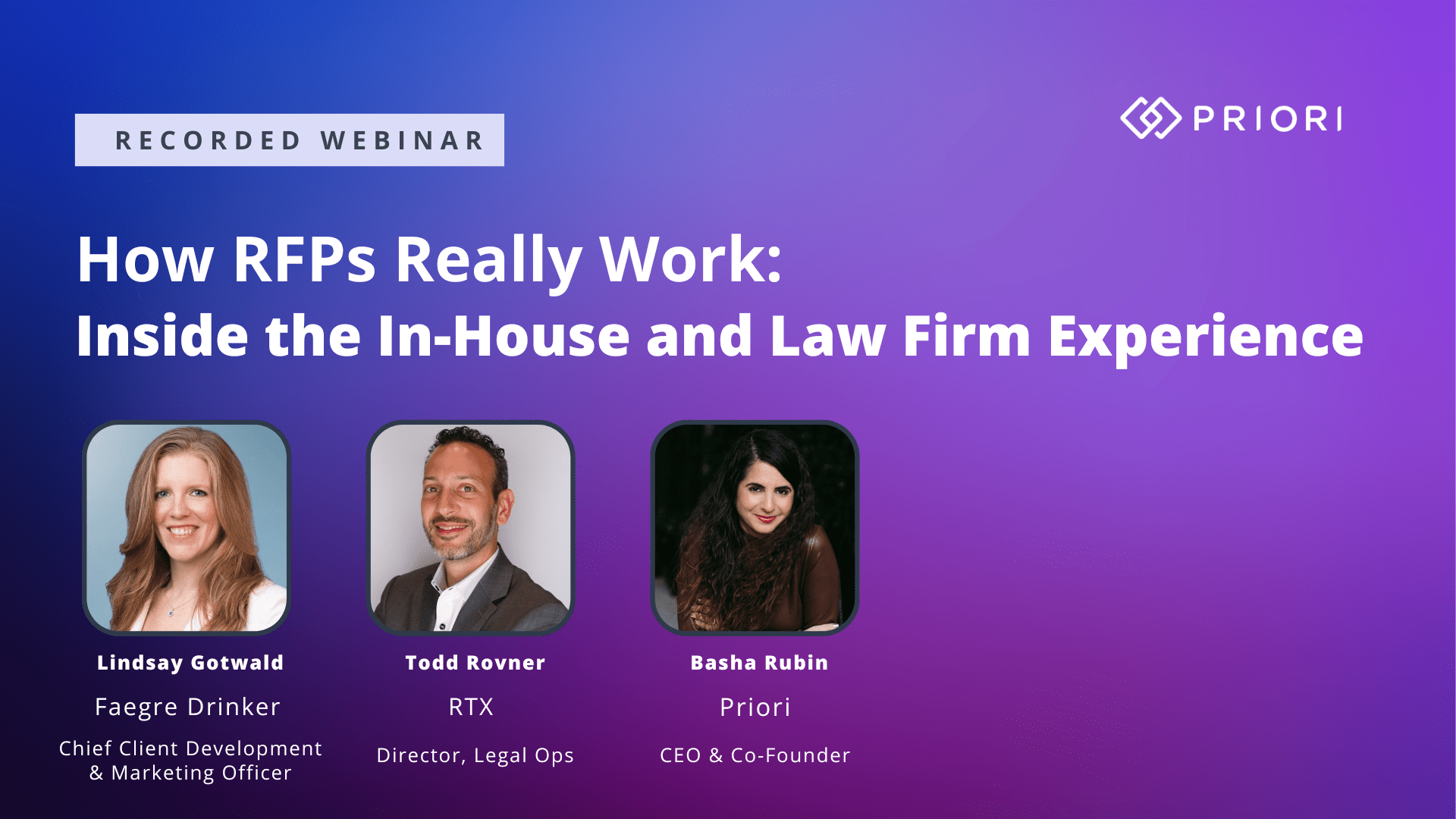 That was the focus of our recent webinar, How RFPs Really Work: Inside the In-House and Law Firm Experience, featuring a candid conversation between leaders who brought both in-house and law firm perspectives to the discussion: